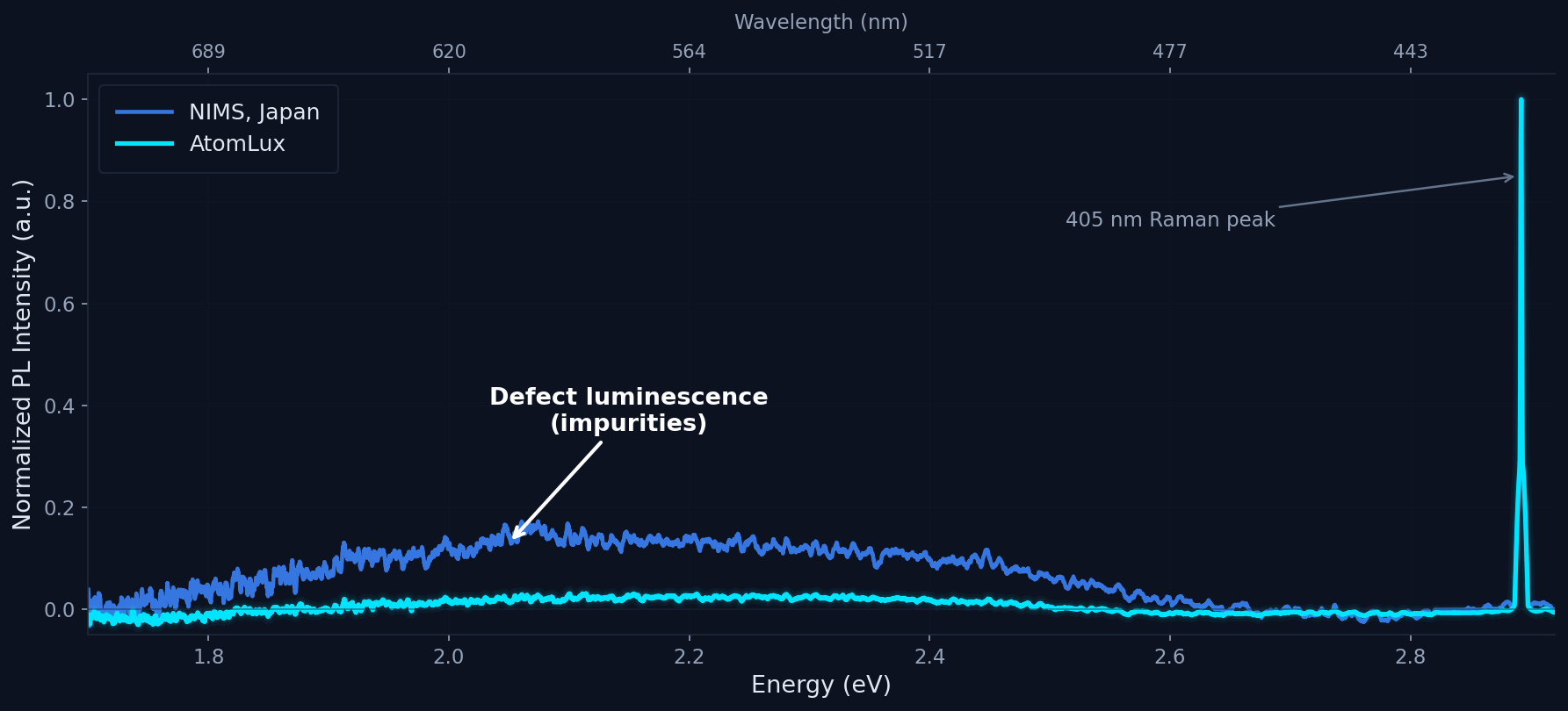 AtomLux grows hBN in-house with purity that matches or exceeds NIMS — verified by photoluminescence and Raman spectroscopy. We grow every boron and nitrogen isotopic combination (¹⁰B, ¹¹B, ¹⁴N, ¹⁵N) at ultra-high purity.
